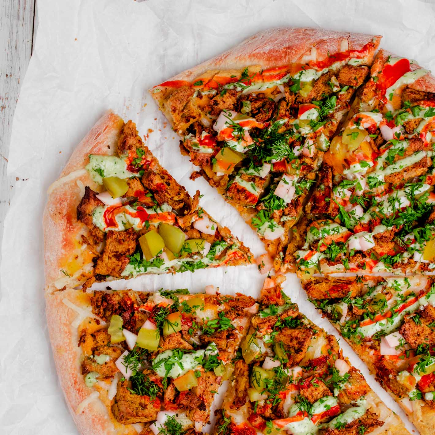 Pizza base, Mozzarella, Shawarma chicken, white sauce, onion, tomato